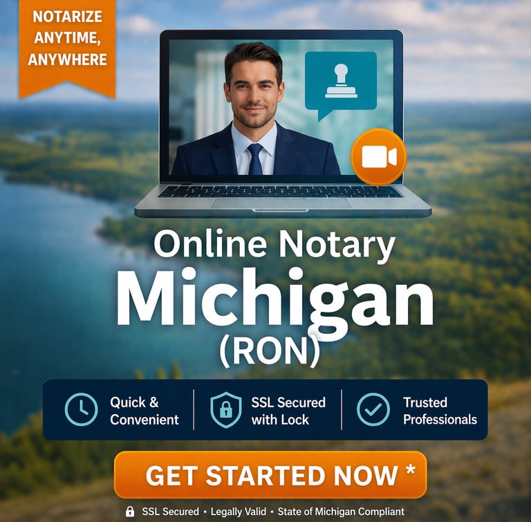 Get many Michigan documents notarized legally from your phone or computer in under 15 minutes. No travel, no waiting rooms, no bank hours — RON is statewide, 24 hours a day.