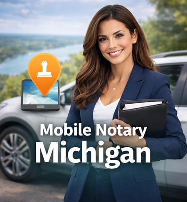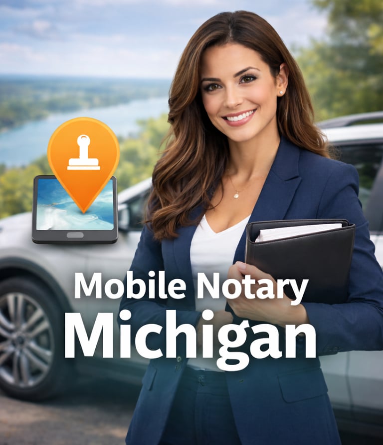 Michigan mobile notaries are commissioned notary publics who travel directly to your location — home, office, hospital, or care facility — to witness and authenticate document signings in person.